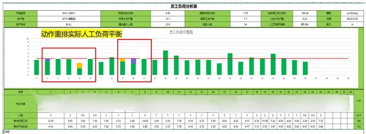 ملازمین کے کام کے بوجھ کی شرح صلاحیت میں بہتری کا ایک بنیادی عنصر ہے۔ عمل کے مابین متضاد سائیکل کے اوقات کی وجہ سے ، اصل پیداوار نسبتا low کم تھی۔ پچھلے لائن میں توازن پیدا کرنے میں بہتری سے جمع ہونے والے تجربے کا فائدہ اٹھانا ، ایم ای ڈیپارٹمنٹ نے پروڈکشن لائن ملازمین کے کام کے بوجھ بیلنس کی شرح کو بڑھانے کے لئے ڈرائیونگ کے اقدامات میں برتری حاصل کی۔ عمل کو بہتر بنانے کے لئے ای سی آر ایس کے اصول (ختم ، یکجا ، دوبارہ ترتیب دینے ، آسان بنائیں) کا اطلاق کرکے ، ملازمین کے کام کے بوجھ کے توازن کی شرح 82 ٪ سے زیادہ تک پہنچ گئی۔